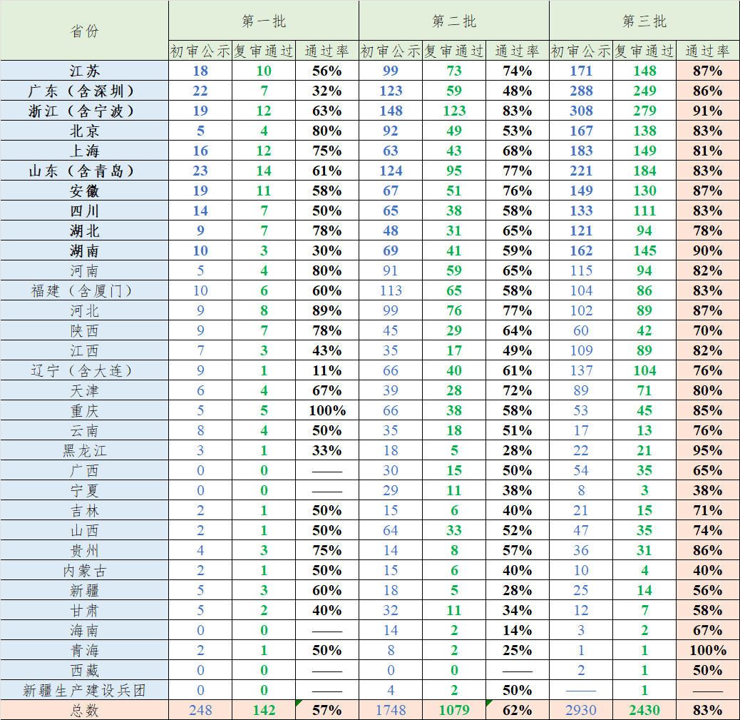 2022年以來,工信部已完成對前三批專精特新小巨人企業復審工作,通過復審的第一至三批小巨人數量分別為:142家,1079家,2430家。據計算,第三批小巨人復審通過率約為83%,為歷史新高,超越了前年和去年的57%62%(詳見圖3)。
