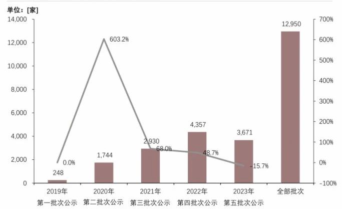 2019年啟動專精特新小巨人企業培育工作以來,企業數量呈階段性變化。早期認定數量穩步增長,進入十四五時期,隨著培育工作上升至國家戰略高度,相關政策不斷完善,如《十四五促進中小企業發展規劃》明確培育目標,《優質中小企業梯度培育管理暫行辦法》細化評定標準,地方政府也紛紛出臺配套政策,推動2021—2022年企業認定數量快速攀升。但現階段認定速度有所放緩,第五批次認定數量相比第四批次有所減少。