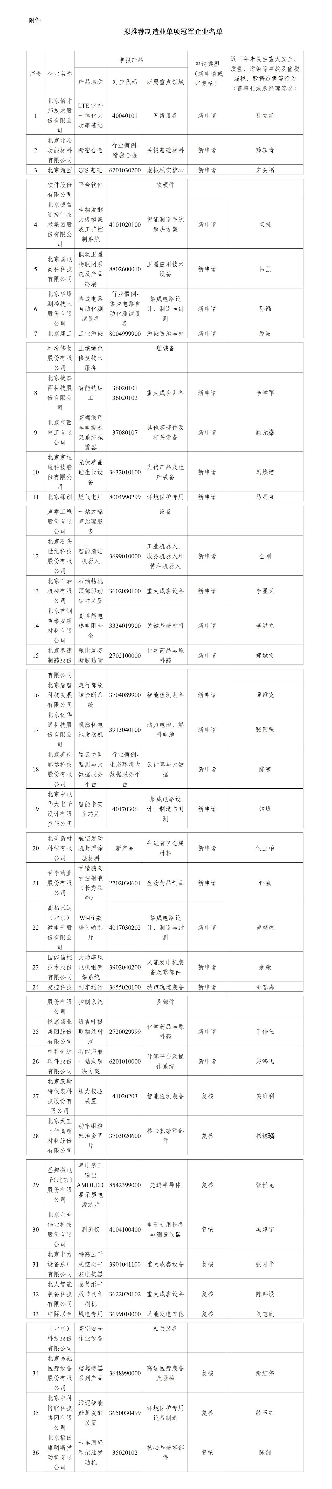 根據《工業和信息化部辦公廳關于開展2024年制造業單項冠軍企業遴選認定和復核評價工作的通知》(工信廳政法函〔2024〕328號),北京市經濟和信息化局組織開展了2024年國家制造業單項冠軍企業遴選認定和復核評價推薦工作,已按規定程序完成相關審核、公示及上報。現根據工信部相關工作部署,按照公示模板再次公示(詳見附件)。
