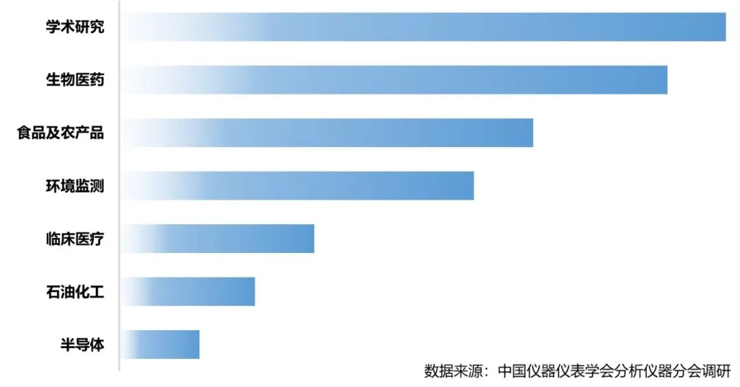 根據(jù)調(diào)研得知,2020-2022年學(xué)術(shù)研究及生物醫(yī)藥領(lǐng)域?qū)χ袊?guó)質(zhì)譜市場(chǎng)擴(kuò)容的貢獻(xiàn)最大,其中學(xué)術(shù)研究領(lǐng)域約占1/4市場(chǎng),高校、科研院所屬于各類質(zhì)譜的采購(gòu)大戶,具備穩(wěn)定持續(xù)的購(gòu)買力;其次是生物醫(yī)藥領(lǐng)域,藥企、CRO/CMO及第三方檢測(cè)機(jī)構(gòu)的質(zhì)譜需求持續(xù)旺盛;食品/農(nóng)產(chǎn)品檢測(cè)、環(huán)境監(jiān)測(cè)、石油化工(天然氣)、半導(dǎo)體等領(lǐng)域?qū)儆谫|(zhì)譜儀器應(yīng)用較廣的市場(chǎng)領(lǐng)域,具備非常龐大的質(zhì)譜儀器保有量。