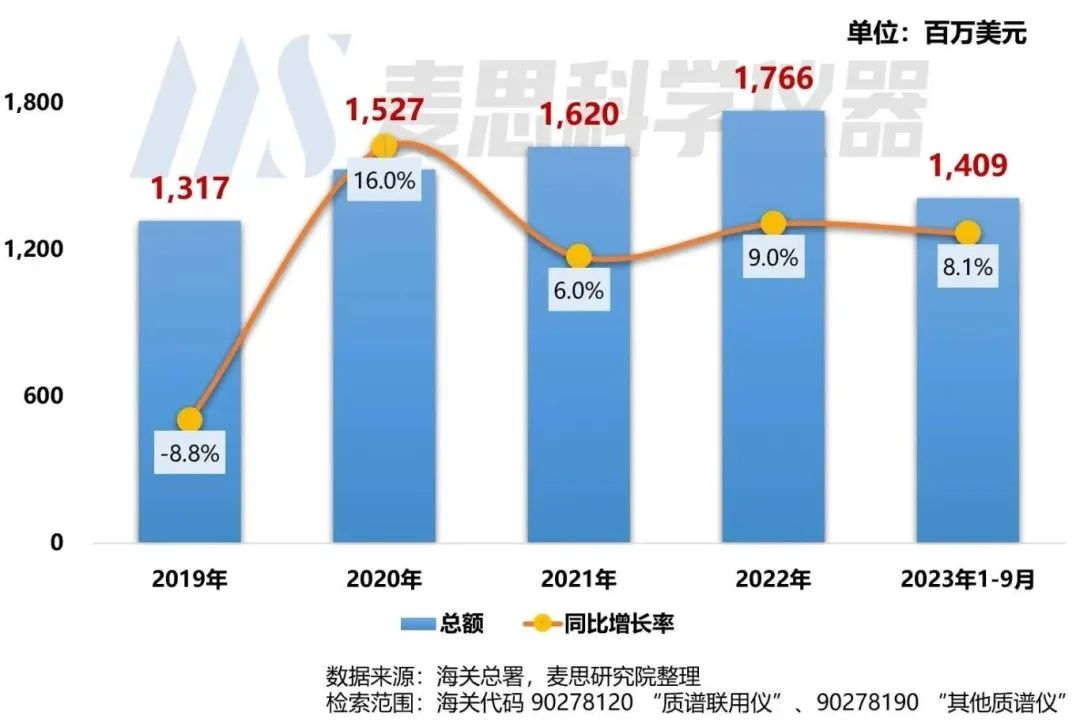 根據(jù)中國(guó)海關(guān)總署最新數(shù)據(jù)顯示,2023年1-9月我國(guó)質(zhì)譜儀器進(jìn)口金額為14.1億美元,折合人民幣約100億元,同比上升8.1%,可見,國(guó)內(nèi)市場(chǎng)對(duì)于進(jìn)口質(zhì)譜儀器的需求依然保持旺盛,今后國(guó)內(nèi)質(zhì)譜需求可能在相當(dāng)長(zhǎng)一段時(shí)間內(nèi)仍將依賴進(jìn)口。不過質(zhì)譜自主研發(fā)及國(guó)產(chǎn)替代的政策利好形勢(shì)已經(jīng)非常明朗,且越來越多的科研用戶也開始接納國(guó)產(chǎn)品牌,隨著國(guó)產(chǎn)質(zhì)譜技術(shù)的突破以及產(chǎn)品的成熟,國(guó)產(chǎn)質(zhì)譜儀器市場(chǎng)份額將會(huì)持續(xù)上漲。