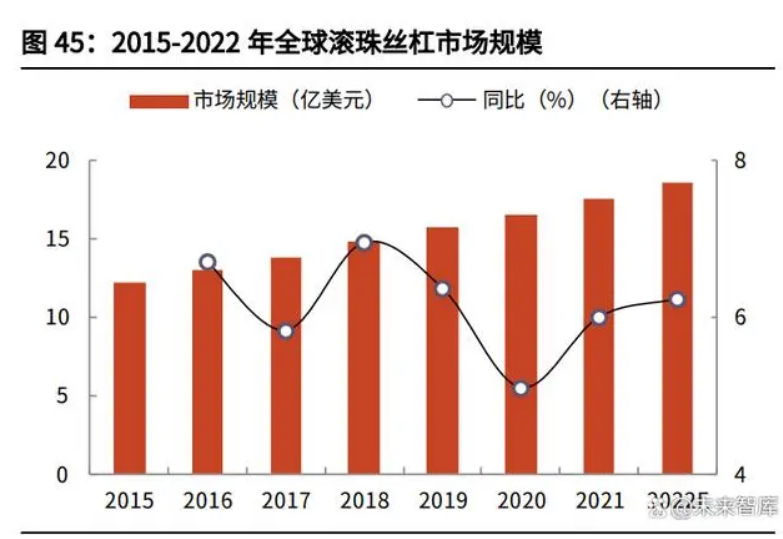 從市場空間來看,全球滾珠絲杠市場規模穩健增長,中國已成為最重要的消費市 場之一,長期成長空間可觀。根據秦川機床公告,2016-2021 年全球滾珠絲杠市 場規模從 13.1 億美元增長至17.5 億美元;同期我國滾珠絲杠市場規模從 16.8 億元增長至25.6 億元。中國已成為滾珠絲杠產品重要的消費市場之一,約占全 球規模總量的 20%左右。從市場競爭格局看,目前全球主要的滾珠絲杠廠商有 NSKTHKSKF 等,根 據華經產業研究院統計,2021 CR5 銷售額市占率達到約 46%,其中主要來自 歐洲和日本,日本和歐洲滾珠絲杠企業占據了全球約 70%的市場份額。