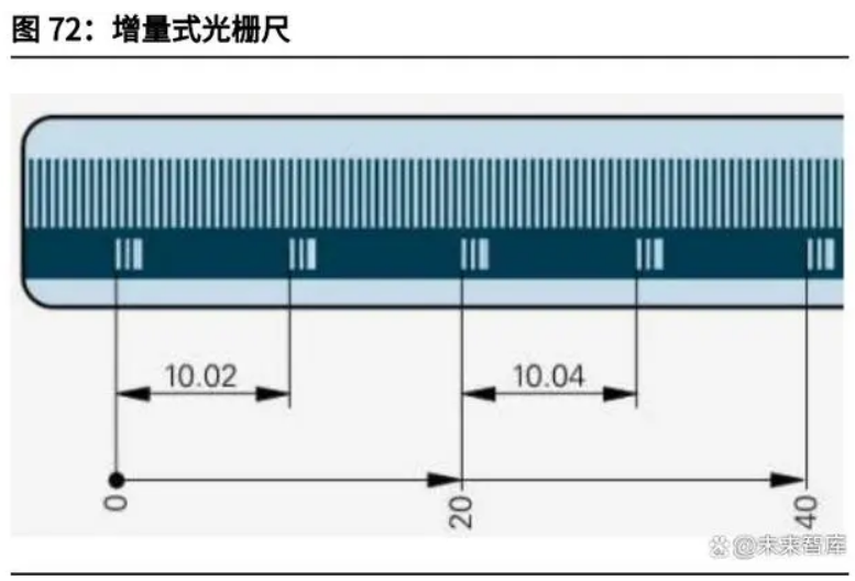光柵尺是光柵線位移傳感器的簡稱,是一種利用光柵原理實現線位移測量的傳感 器。光柵線位移傳感器主要應用于直線移動導軌機構,可實現移動量的精確顯示 和自動控制,廣泛應用于金屬切削機床加工量的數字顯示和 CNC 加工中心位置 環的控制。按照材質不同,可分為玻璃光柵和鋼光柵;按照測量原理可分為絕對式和增量式;按照掃描方式可分為成像掃描和干涉掃描;按照防護性能不同,可分為封閉式光 柵尺和開放式光柵尺。從產品類型及技術方面來看,目前增量式光柵尺由于較低的成本和技術要求,占 有超過 80%的份額。預計未來幾年,絕對式光柵尺將保持更快的增長速度。