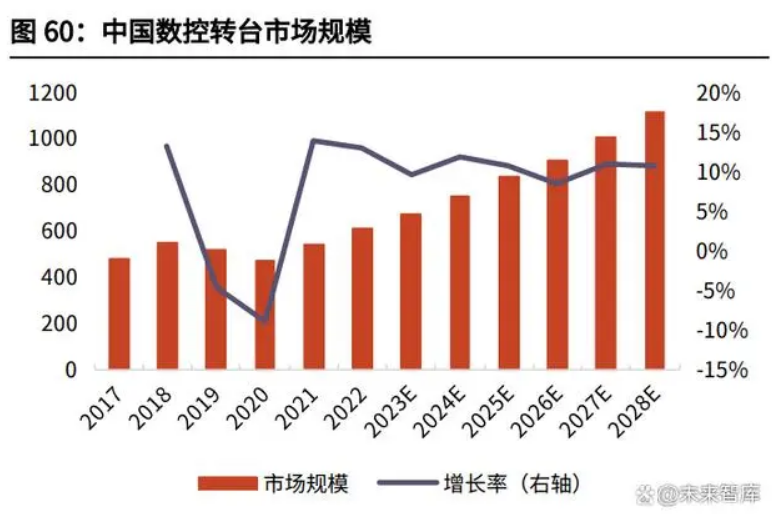 大陸及中國臺灣地區生產廠家生產的中低檔數控轉臺占據了我國大部分的轉臺 市場;少部分市場由美國、德國、日本等國家公司生產的高端產品所占據。內地 最具競爭力的數控轉臺生產廠家是煙臺環球機床附件集團有限公司,該廠家的產 品體系完備,規格齊全,種類繁多,且設計開發和制造方面具備豐富的經驗。中 國臺灣地區的德川機械股份有限公司是專業數控轉臺生產廠商之一。國外有日本 NIKKEN(日研)、德國 Peiseler、美國 HASS 公司等專業的生產廠家。國內 生產的數控轉臺產品與國外的產品相比,在精度、速度及可靠性等參數上仍與國 外數控轉臺存在一定差距。2021 年中國數控轉臺市場銷售收入達到了 5.43 億美元,據 QYResearch 預計, 2028 年可以達到 11.17 億美元。從產品類型及技術方面來看,單軸占有重要地位,2021 年份額達到 89.43%, 銷量達到 58678 臺,而雙軸由于價格較貴,從 2021 年銷量上來看僅為單軸的 1/9,達到 6935 臺,但銷售額超過單軸的 1/3,達到 1.44 億美元。預計未來單 軸和雙軸的比例穩定,在 2028 年,單軸的銷量將達到 104280 臺,而雙軸達到 13671 臺。從產品市場應用情況來看,與立式數控機床配套使用的數控轉臺最多,接近 60%,在 2021 年達到 38816 臺,而臥式和龍門分別達到 19330 臺與 7467 臺。未來增長速度最快的為龍門數控機床,2022-2028 年的 CAGR 達到 9.69%。目 前中國主要廠商包括旭陽國際精機、寶嘉誠、德川機械、潭佳精密科技和潭興精 工等,2021 Top5 廠商份額占比超過 50%