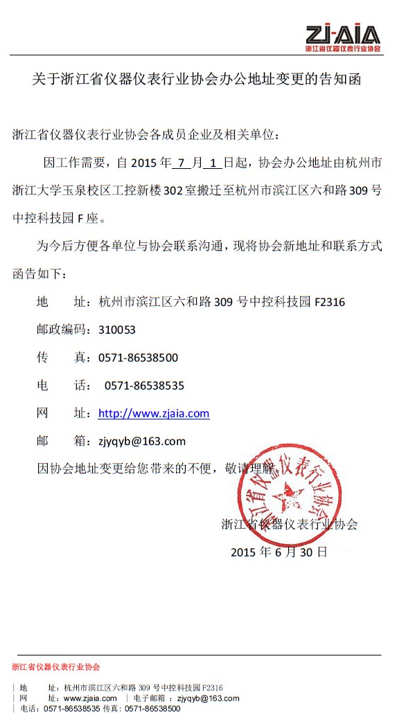 關(guān)于浙江省儀器儀表行業(yè)協(xié)會(huì)辦公地址變更的通知