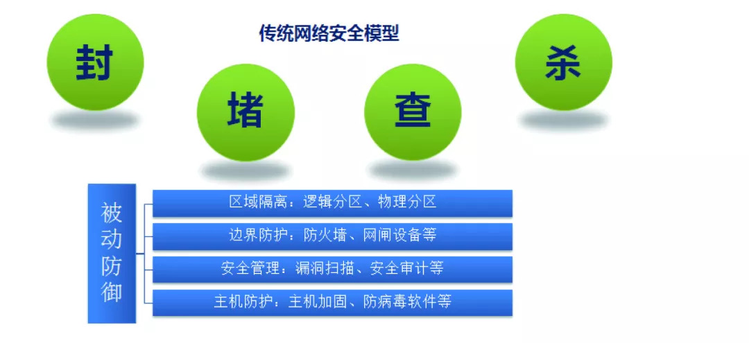 傳統的信息安全防護機制通過對關鍵網絡節點和數據出入口采取必要的訪問控制和權限控制來達到信息安全防護的目的。傳統的被動式防護體系主要采用“封”、“堵”、“查”、“殺”的策略對保護系統環境進行安全過濾,主要依賴以下防護手段實現: