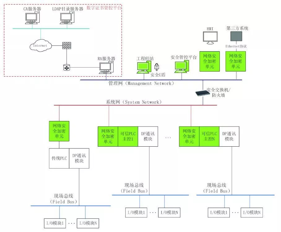 通過在現有工業控制系統的拓撲基礎上,增加可離線運行的數字證書管理平臺、高度集成的安全管控平臺以及集成主動安全防護技術的核心安全控制器,構筑能夠對已知威脅、未知威脅、外部非法訪問、內部非法接入等各類信息安全威脅的核心抵御能力。
