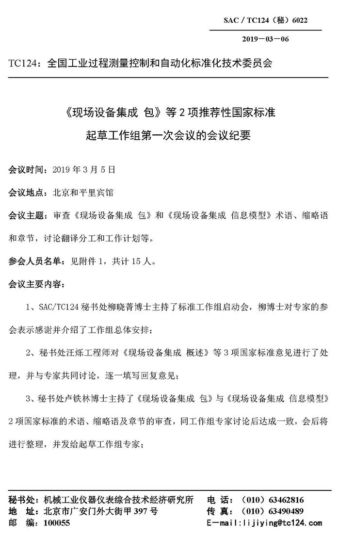 為解決當(dāng)前智能制造在集成和互聯(lián)互通標(biāo)準(zhǔn)化方面存在的問(wèn)題,根據(jù)國(guó)家標(biāo)準(zhǔn)制修訂細(xì)則的要求,經(jīng)研究決定,全國(guó)工業(yè)過(guò)程測(cè)量控制和自動(dòng)化標(biāo)準(zhǔn)化技術(shù)委員會(huì)成立了2019年度 SAC/TC124國(guó)家智能制造標(biāo)準(zhǔn)《現(xiàn)場(chǎng)設(shè)備集成》(第 4~5部分)起草工作組,并于2019年3月5日在北京召開(kāi)第一次工作組會(huì)議。此次大會(huì)有來(lái)自全國(guó)工業(yè)控制領(lǐng)域的十九位資深專家和一些長(zhǎng)期從事標(biāo)準(zhǔn)編寫(xiě)工作的人員參與,作為長(zhǎng)期主持或參與國(guó)家標(biāo)準(zhǔn)制定的福建順昌虹潤(rùn)精密儀器有限公司,也派副總陳志揚(yáng)參加了這次的啟動(dòng)大會(huì)。