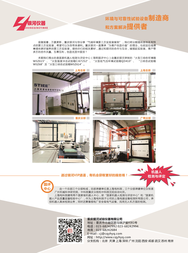 重慶銀河承制國家機器人檢測與評定中心(簡稱國評中心)的“大型三綜合環(huán)境箱WSZ615”、“大型溫度沖擊試驗箱CJ672S2”、“大型低氣壓環(huán)境試驗箱QD410”、 “三綜合試驗箱WSZ68”及“大型三綜合試驗箱WSZ614”。