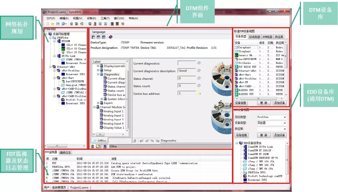 NT6000系統(tǒng)還配備了智能設(shè)備管理軟件SyncAMS設(shè)備管理軟件,應(yīng)用了FDT技術(shù),數(shù)據(jù)透明訪問(wèn),支持不同網(wǎng)絡(luò)的復(fù)雜嵌套通訊,支持復(fù)雜設(shè)備描述,包括高級(jí)診斷和預(yù)測(cè)維護(hù)等功能描述。支持設(shè)備廠家的專(zhuān)有技術(shù),可以嵌套設(shè)備廠家的專(zhuān)業(yè)指導(dǎo),充分展現(xiàn)各廠商智能設(shè)備的固有特性。脫離了死板的表格數(shù)據(jù)。