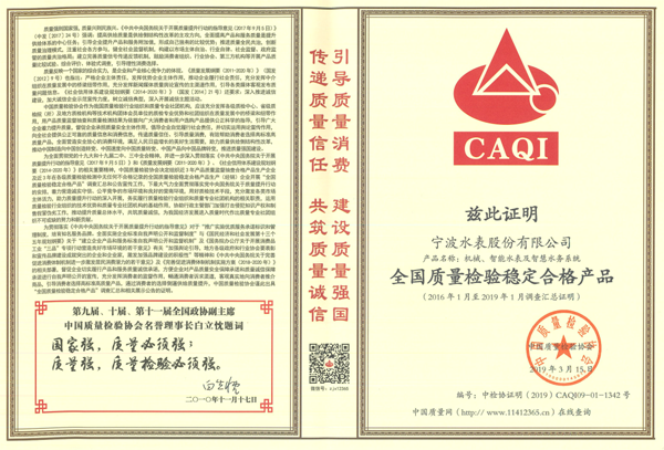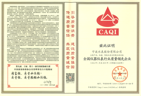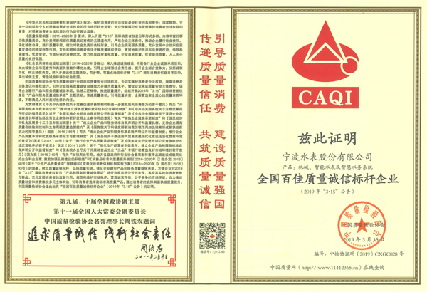 為響應國家推進質量強國建設,嚴格企業主體責任,推動企業履行社會責任,踐行質量承諾的號召,中國質量檢驗協會組織開展了“3.15”國際消費者權益日系列主題活動,寧波水表股份有限公司在活動評選中獲得4項榮譽:全國產品和服務質量誠信示范企業、全國百佳質量誠信標桿企業、全國質量檢驗穩定合格產品及全國儀器儀表行業質量領先企業。此項評選結果是通過對企業自2016年1月至2019年1月期間調查匯總所得,充分肯定了寧波水表近幾年來在質量誠信、服務領先方面的良好表現。