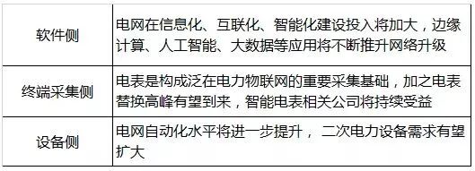 泛在電力物聯網將對信息化、智能化、自動化提出更高要求,涉及智能芯片、智能傳感及智能終端、一體化通信網絡、物聯網平臺、網絡信息安全、人工智能等核心技術及產品, 對軟件側和設備側均提供了更大市場和升級空間。