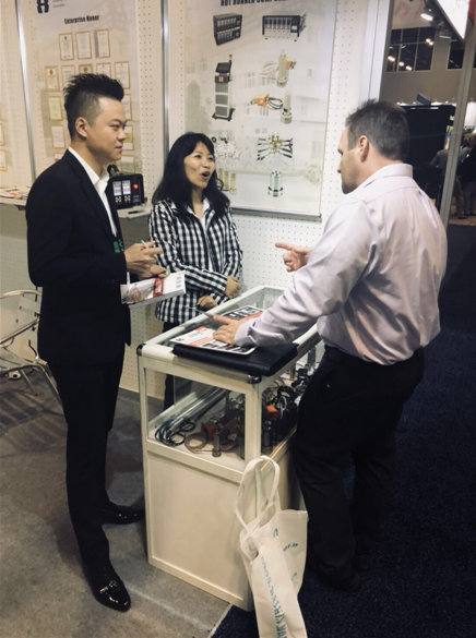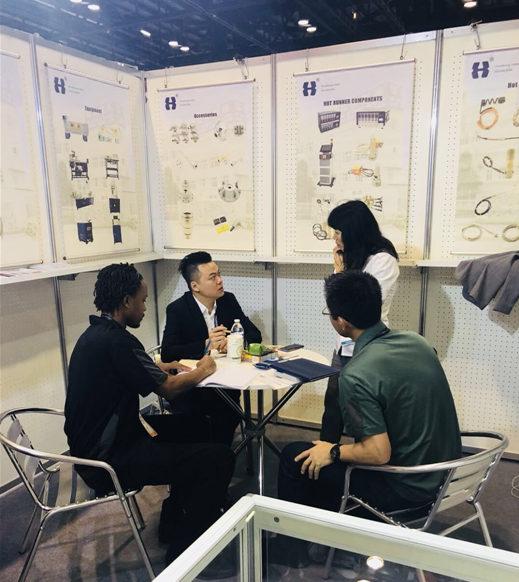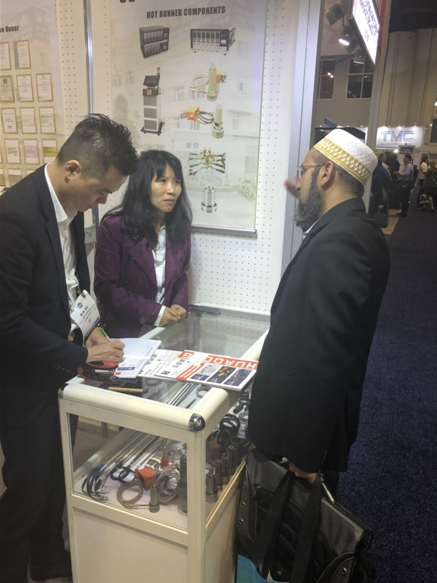 華東儀表此次參展的產品主要為熱流道模具加熱器,展位前,被產品吸引的國際友人絡繹不絕,他們中大多數為美國本土甚至為全球范圍內橡塑行業中的精英。華東儀表過硬的資質、優秀的產品質量以及廠長吳奔專業的解答都給他們留下了深刻的印象。