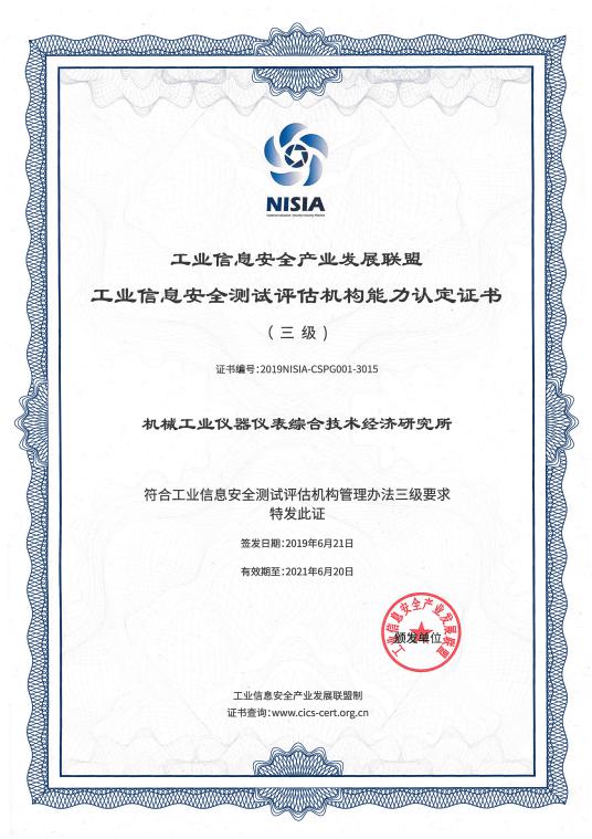 2019年6月21日,機械工業儀器儀表綜合技術經濟研究所(以下簡稱“儀綜所”)獲得工業信息安全測試評估機構能力認定證書。