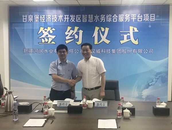 2019年7月3日上午12:00,新疆河潤水業有限責任公司與漢威科技集團股份有限公司在新疆河潤水業五樓會議室舉行了“甘泉堡經濟技術開發區智慧水務綜合服務平臺項目”簽約儀式。