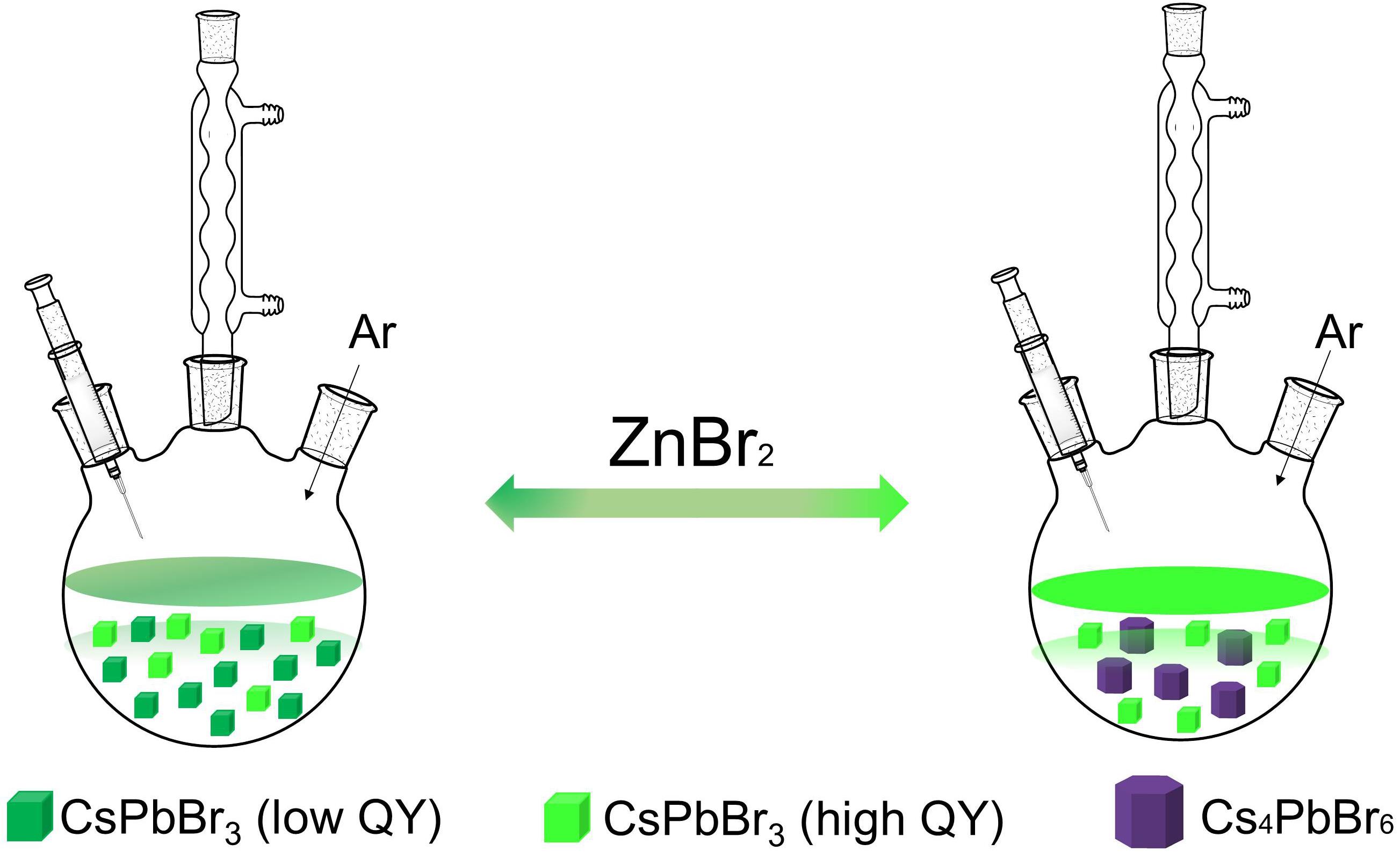 在ZnBr2誘導劑作用下CsPbBr3和Cs4PbBr6鈣鈦礦納米晶結構轉換的示意圖