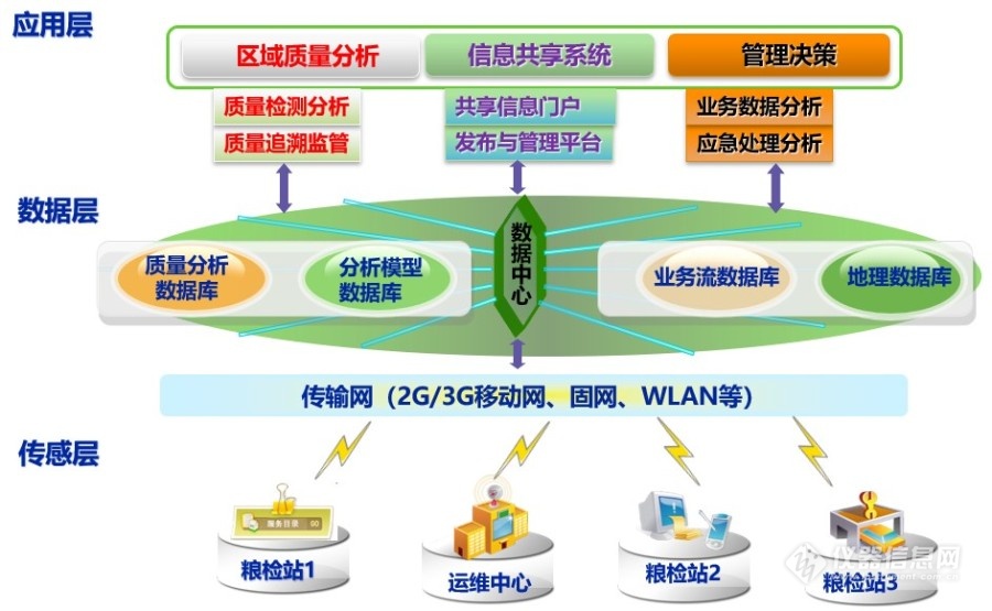 在糧油加工領域取得突破后,聚光開始攻關國家糧食和物資儲備局,努力將國產近紅外分析儀打入國家糧食質檢體系。2014年,聚光為國家糧食質檢研制了高端網絡化近紅外分析儀SupNIR-3000(如下圖2所示)。該型分析儀通過雙模式自校正等創新設計,突破了近紅外分析儀一致性瓶頸,結合稻谷、小麥、玉米、大豆、菜籽等大宗糧食油料水分、蛋白、淀粉、面筋、脂肪酸值、品嘗評分等相關指標分析模型,形成了成熟的糧食快速分析專用的近紅外分析系統,并在此基礎上開展近紅外網絡化應用開發,構建了近紅外儀器傳感層、數據分析層和應用服務層的三層近紅外網絡分析系統(如下圖3所示)。通過糧情數據采集、標準化、大型數據庫系統的數據匯總分析,為糧情監測、決策提供數據支持,打破了國外進口近紅外產品在國家糧食質檢領域的壟斷局面,幾年來在多個省區糧食質檢系統取得了不錯的成績。