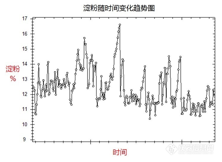 該系統從分析探頭接收到的光信號,經過光纖傳輸到儀表單元內,轉化成為光譜信號,該光譜信號傳輸給在線分析軟件后,通過近紅外檢測模型的演算得到測量值,該測量值回傳給儀表單元,在儀表單元轉化為控制信號后,通過電纜傳送給中控系統,用于在線調控。下圖6展示的是在線連續監測淀粉的趨勢結果。該系統已經成功應用于其配糧系統,并獲得省科技進步獎。