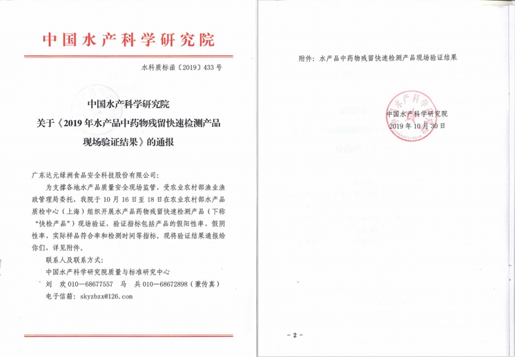 2019年10月16-18日,廣東達(dá)元綠洲食品安全科技股份有限公司參加了由農(nóng)業(yè)農(nóng)村部漁業(yè)漁政管理局主辦,中國水產(chǎn)科學(xué)研究院承辦的“2019年水產(chǎn)品中藥物殘留快檢產(chǎn)品的驗證”工作,食安科技生產(chǎn)的孔雀石綠快速檢測盒(FST-膠體金)、氯霉素快速檢測盒(膠體金)、呋喃類代謝物快速檢測盒(膠體金)、呋喃類代謝物快速檢測盒(FST-熒光層析)等10項產(chǎn)品全部通過驗證!