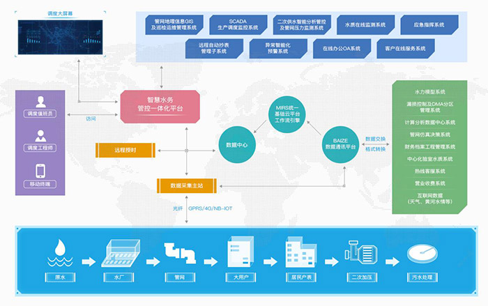 該平臺結合水務行業需求及水務信息化發展趨勢,以水務數據為核心、物聯網為基礎,以WiFi、4G、NBIOT全覆蓋,寬帶通信為高速信息通道,建立覆蓋供、排水全過程的水聯網,構建智慧水務智能應用,實現整合水務企業原有應用系統,構建水務行業從源水到管網、從泵站到用戶終端的供排水全過程數據采集及監測體系,實現管網全生命周期管理及供排水全過程的精細化管理以及智能調度,為給排水安全管理及運營服務提供決策支持。
