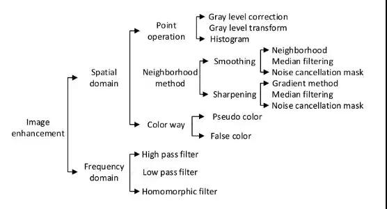由于紅外信號波動范圍很大,再加上硬件設備本身存在的缺陷和環境因素的影響,在將其轉換為適于人眼觀看的可見光圖像時,易造成圖像的模糊、細節丟失、對比度低下等問題。因此,獲取成像清晰且對比度高的圖像,是紅外圖像處理中的一項重要技術。傳統的紅外圖像增強技術主要分為空域圖像增強和頻域圖像增強兩類,具體分類如圖2所示??沼蚴侵冈搱D像的所有像素集合,是通過對圖像中像素灰度值進行處理來達到增強效果的,如灰度值變換、直方圖均衡技術、圖像平滑和銳化處理、偽彩色處理等技術。頻域圖像增強是對圖像經傅里葉變換后的頻譜成分進行操作,然后逆傅里葉變換獲得結果,包括低通濾波技術、高通濾波技術、同態濾波技術等。一般情況下,某一類算法只能解決圖像中出現的一種問題。因此,針對現實中紅外圖像出現的復雜問題,為了提升圖像處理效果,往往需要多種算法結合使用。目前,在國內外學者不斷研究與改進下,給出了更多性能較為完善的算法。