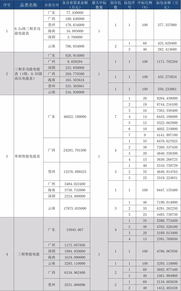 南方電網公司2019年計量產品(電能表)第二批框架招標項目(招標編號:0002200000063270)由中國南方電網有限責任公司委托南方電網物資有限公司作為招標代理機構采用公開招標方式進行。本次招標分4個品類、15個標的、34個標包。物資品類分別為:0.2S級三相多功能電能表、三相多功能電表(1級、0.5S級高壓電能表)、單相智能電能表和三相智能電能表。