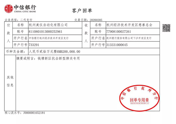 2月5日,杭州美儀自動化有限公司向杭州經濟技術開發區慈善總會捐贈20萬元支援疫情一線。