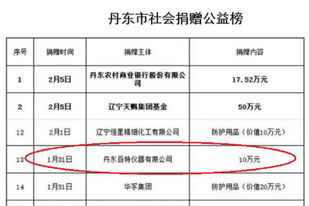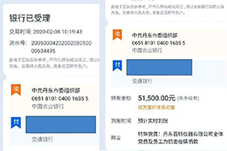 2月8日上午,丹東百特黨支部將凝聚著33名黨員和136名員工拳拳愛國(guó)之心的51500元的特殊黨費(fèi)匯到中共丹東市委組織部。市委組織部領(lǐng)導(dǎo)稱贊百特是“愛黨愛國(guó)的典范,抗擊疫情的榜樣”。