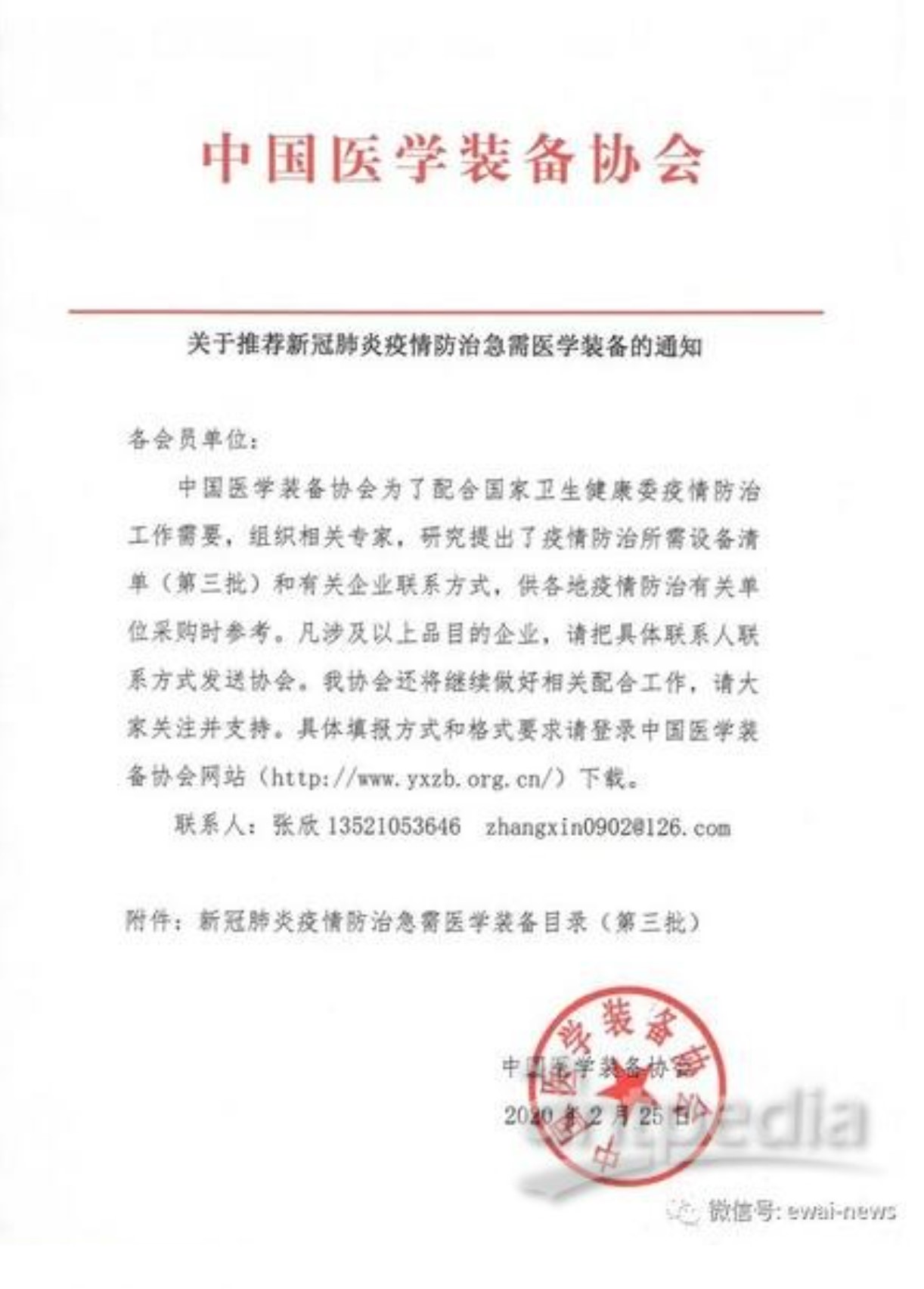 關(guān)于推薦新冠肺炎疫情防治急需醫(yī)學(xué)裝備的通知