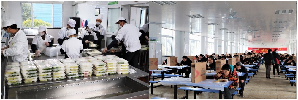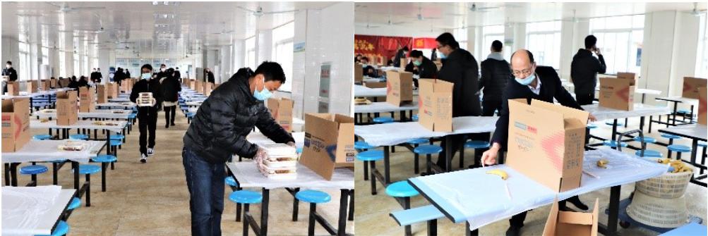 在清晨的寒風中,他們站立于門崗口,手持測溫槍,為前來上班的員工一一測量體溫……不到中午11點,又總能看到那么幾個身影出現(xiàn)在食堂。他們?yōu)槊颗斡貌蛦T工提前鋪好一次性餐布,擺放好餐具、餐盤,直至將所有批次分餐結(jié)束……