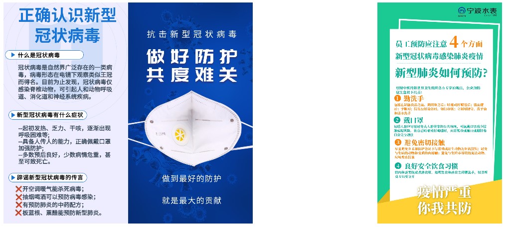 2020年2月8日,寧波水表在公司“創意魚群”等微信公眾號上發布《寧波水表—安全生產思維阻擊疫情》等宣傳資料,并號召全員積極轉發朋友圈、各類微信群,通過對疫情期間防護工具、防疫要素等相關知識的教育宣傳,進一步提高全司員工及公眾對疫情的自我防護意識。