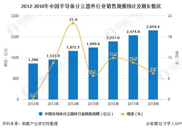 據(jù)半導(dǎo)體行業(yè)協(xié)會統(tǒng)計(jì)數(shù)據(jù)顯示, 2012年至2018年國內(nèi)半導(dǎo)體分立器件市場需求保持了11.41%的年均復(fù)合增長;2018年國內(nèi)半導(dǎo)體分立器件市場需求達(dá)到2699.8億元,同比2017年的2458.1億元增長率達(dá)到9.8%,繼續(xù)保持著高速增長趨勢。其中,半導(dǎo)體功率器件仍是帶動中國半導(dǎo)體分立器件市場加速增長的主要動力。