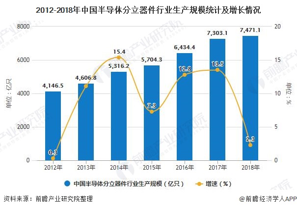 下游市場需求直接拉動了半導(dǎo)體分立器件的生產(chǎn)規(guī)模。改革開放以來,特別是進(jìn)入21世紀(jì)后,我國半導(dǎo)體分應(yīng)器件行業(yè)內(nèi)企業(yè)不斷增加,分立器件的產(chǎn)量隨之攀升;2012年,我國半導(dǎo)體分立器件的整體生產(chǎn)規(guī)模為4606.8億只,至2018年增長至7471.1億只,年均復(fù)合增長率達(dá)到8.82%。