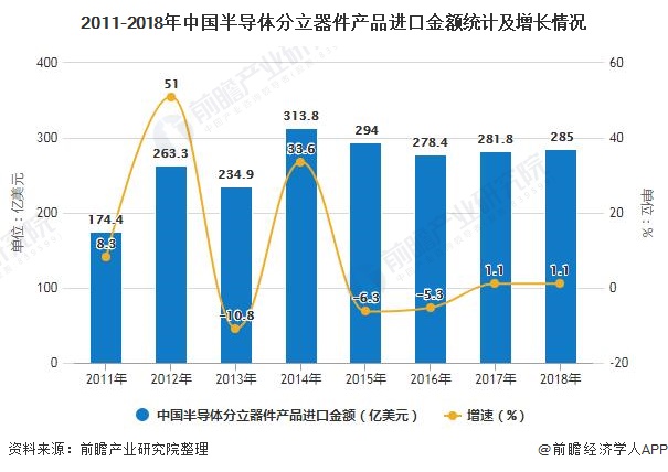 半導(dǎo)體行業(yè)發(fā)源于歐美,日韓及中國臺灣在產(chǎn)業(yè)轉(zhuǎn)移中亦建立了先進(jìn)的半導(dǎo)體工業(yè)體系。中國半導(dǎo)體起步晚、追趕難度較大。近年來,我國高度重視半導(dǎo)體行業(yè)的發(fā)展,不斷出臺多項(xiàng)鼓勵政策大力扶持包括分立器件在內(nèi)的半導(dǎo)體行業(yè),半導(dǎo)體分立器件行業(yè)已獲得長足發(fā)展,并逐步形成對國外產(chǎn)品的替代。據(jù)中國半導(dǎo)體行業(yè)協(xié)會統(tǒng)計(jì),2011年至2014年中國半導(dǎo)體分立器件產(chǎn)品進(jìn)口額基本保持增長趨勢,2014年進(jìn)口額達(dá)313.8億美元。2017年中國半導(dǎo)體分立器件進(jìn)口金額為281.8億美元,相較于2014年進(jìn)口額下降了10.20%,2018年中國半導(dǎo)體分立器件進(jìn)口金額為285.0億美元,與2017年基本持平。