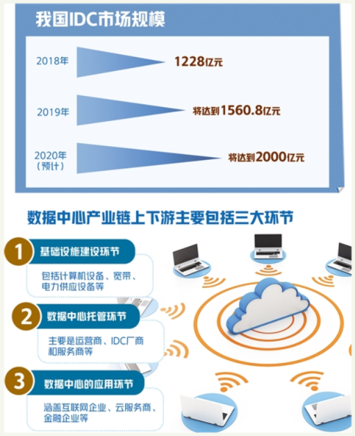 根據前瞻產業研究院的數據,2018年我國IDC市場規模為1228億元,2019年將達到1560.8億元,同比增長27.1%,按照該統計口徑,且考慮到政策支持力度的加大,預計2020年數據中心的市場規模將達到2000億元。
