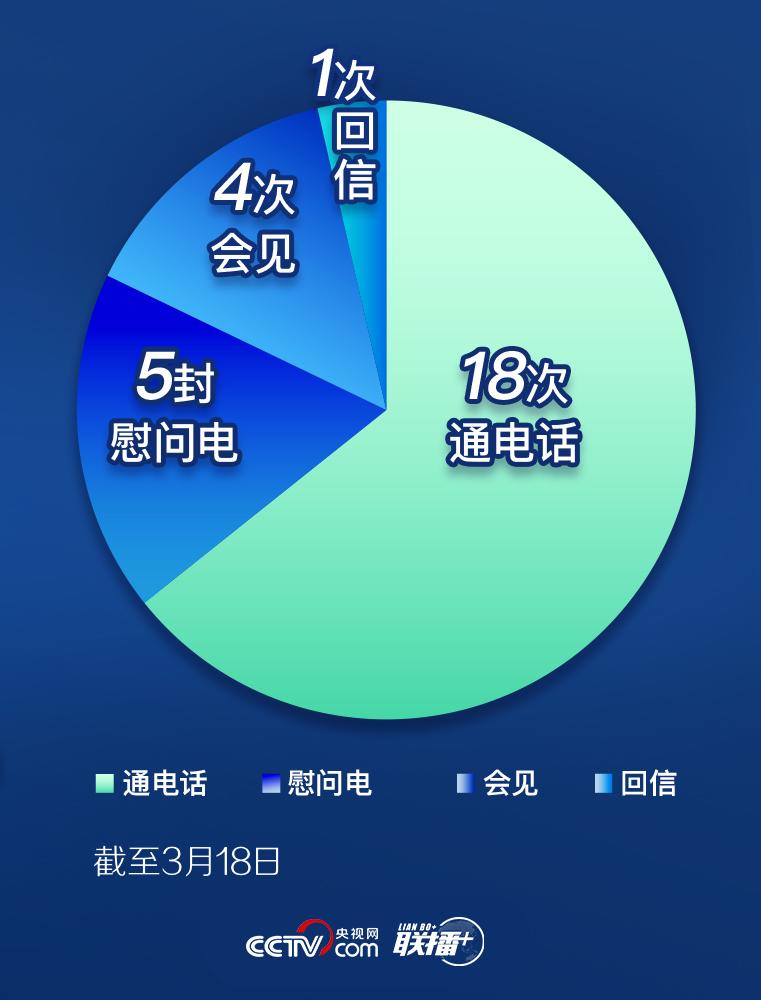 習近平從疫情發生至今,始終與外國國家元首、政府首腦以及國際和地區組織負責人保持溝通。截至3月18日,他在18通電話、5封慰問電、4次會見、1次回信等互動中,介紹中國疫情防控的舉措、進展,表達休戚與共的中國情誼,傳遞戰勝疫情的信心。