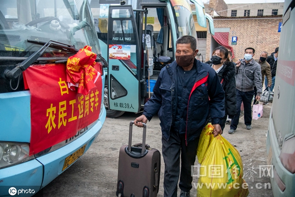 2月27日,陜西省渭南市白水縣人社局為外出務(wù)工人員提供了返崗復(fù)工包車護(hù)送服務(wù),解決了全縣外出務(wù)工人員出行難的問題。(圖片來源:東方IC)