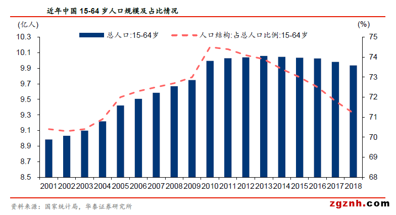 近年來隨著經濟快速增長、國內勞動年齡人口數量下降,勞動力供給拐點已經出現,人口紅利逐步消失。據國家統計局數據顯示,中國15-64歲勞動年齡人口比重自2011年開始下降,15-64歲人口絕對數量也自2014年進入下降階段,2018年15-64歲人口較2013年峰值累計減少約1200萬人。這種人口轉變趨勢在勞動力市場上反映為勞動力短缺、企業招工難、招工貴等現象。