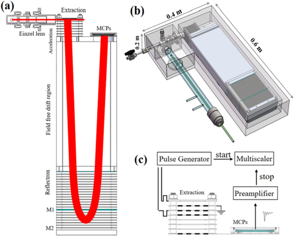 該團(tuán)隊(duì)唐小鋒副研究員和溫作贏博士等人,以真空紫外放電燈作為電離源,自行設(shè)計(jì)和研制了小型真空紫外光電離反射式飛行時(shí)間質(zhì)譜儀,并將之應(yīng)用于大氣自由基反應(yīng)動(dòng)力學(xué)研究。通過(guò)設(shè)計(jì)具有籠式結(jié)構(gòu)的新型聚焦電場(chǎng),實(shí)現(xiàn)了電離區(qū)內(nèi)離子的高效率收集,提高了質(zhì)譜儀的檢測(cè)靈敏度(自由基靈敏度達(dá)到0.3ppb)。同時(shí),通過(guò)采用垂直引入式結(jié)構(gòu)和二級(jí)空間聚焦等關(guān)鍵技術(shù),實(shí)現(xiàn)小型化質(zhì)譜儀高的質(zhì)譜分辨本領(lǐng)(M/△M = 2000, FWHM)。