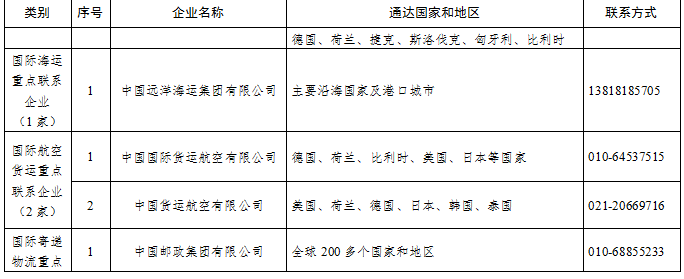 按照國(guó)務(wù)院部署要求,工業(yè)和信息化部配合交通運(yùn)輸部、外交部、商務(wù)部等部門,在國(guó)務(wù)院復(fù)工復(fù)產(chǎn)推進(jìn)工作機(jī)制下成立了國(guó)際物流工作專班,協(xié)調(diào)解決當(dāng)前疫情期間制造業(yè)國(guó)際物流中存在的問(wèn)題。近日,國(guó)際物流工作專班公布第一批國(guó)際物流運(yùn)輸重點(diǎn)聯(lián)系企業(yè)名單,其中綜合物流企業(yè)4家、中歐班列運(yùn)營(yíng)企業(yè)10家、國(guó)際航運(yùn)企業(yè)1家、國(guó)際航空貨運(yùn)企業(yè)2家、國(guó)際寄遞物流企業(yè)2家、國(guó)際道路運(yùn)輸企業(yè)35家。