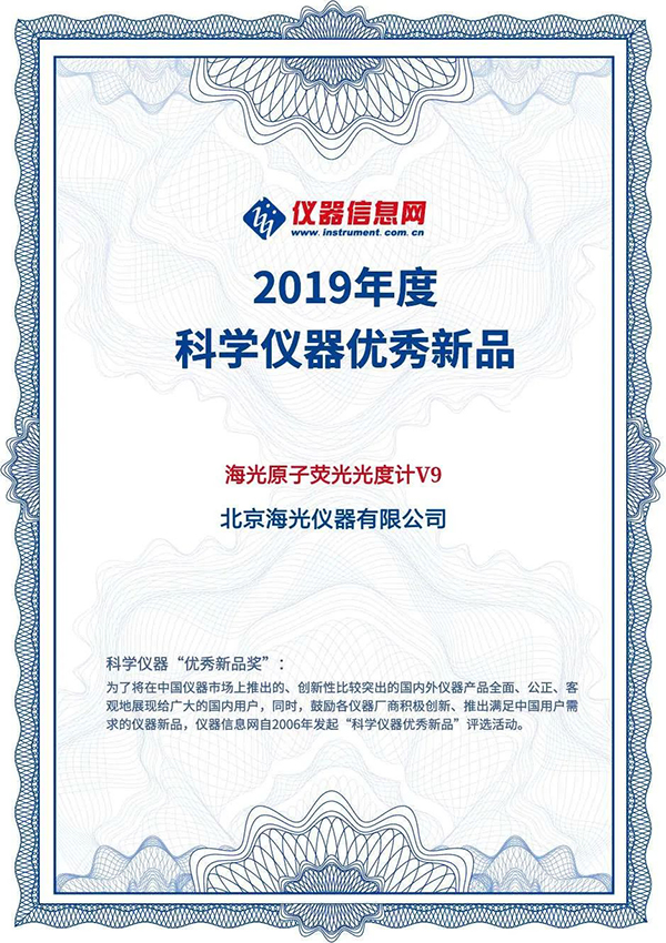 2020年5月20日,由儀器信息網主辦,“科學儀器優秀新品”評審委員會、“新品首發”欄目承辦的科學儀器“優秀新品獎”在線發布盛典盛大召開,2019年度科學儀器“優秀新品獎”獲獎名單首次在云端揭曉,海光HGF-V9原子熒光光度計榮獲該獎項。