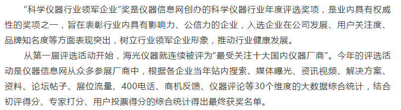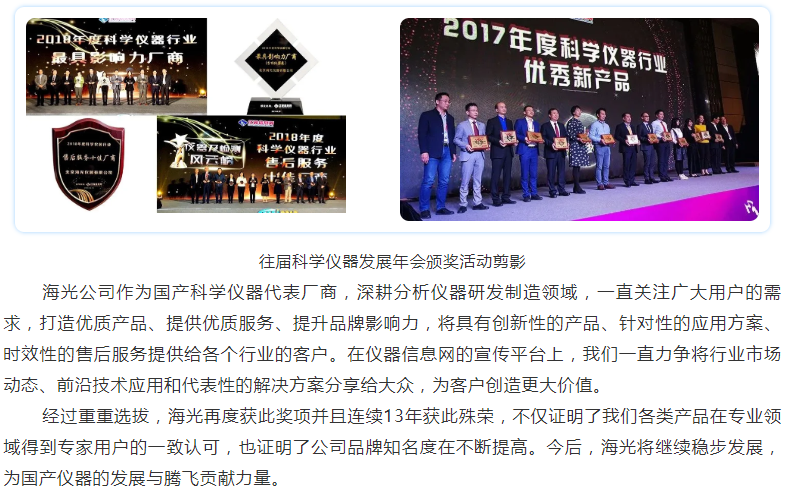 北京海光儀器有限公司是中國儀器儀表行業(yè)協(xié)會常務(wù)理事單位,主要從事分析儀器的研發(fā)、制造、銷售和售后服務(wù), 是中國知名的光譜分析儀器制造廠商,連續(xù)十二年被媒體評為“最具影響力國內(nèi)儀器廠商”稱號,公司通過了質(zhì)量管理體系、環(huán)境管理體系、職業(yè)健康安全體系三大體系認(rèn)證,公司以原子熒光光度計、原子吸收分光光度計、測汞儀、流動分析儀、快速溶劑萃取儀和等離子體發(fā)射光譜儀等分析儀器為主要產(chǎn)品,廣泛應(yīng)用于食品藥品、環(huán)境監(jiān)測、農(nóng)業(yè)、質(zhì)監(jiān)、自來水、檢驗檢疫、地質(zhì)、第三方檢測、科研等領(lǐng)域,產(chǎn)品獲得國家科技進(jìn)步三等獎、七次BCEIA 金獎、自主創(chuàng)新金獎、國產(chǎn)好儀器等多種獎項。日前,2019年度“科學(xué)儀器行業(yè)領(lǐng)軍企業(yè)”(原“最具影響力廠商”)評選活動獲獎名單揭曉,北京海光儀器有限公司獲分析儀器類領(lǐng)軍企業(yè)稱號,也是連續(xù)十三年獲此殊榮。