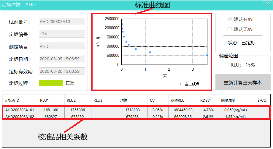 通過呋喃四項校準品發(fā)光值進行算法擬合出當天標準曲線, 校準品各詳細參數(shù)均在下圖中,校準品變異系數(shù)均小于5%。