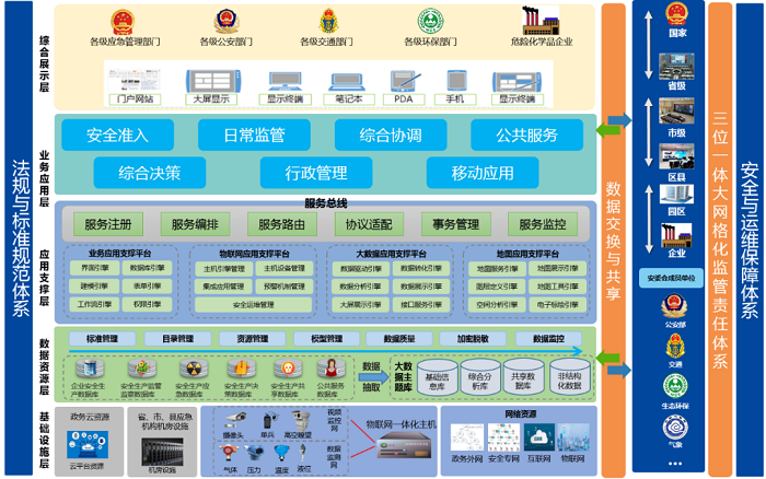 平臺(tái)總體框架自下而上分別為基礎(chǔ)設(shè)施層、數(shù)據(jù)資源層、應(yīng)用支撐層、業(yè)務(wù)應(yīng)用層和綜合展現(xiàn)層,以及兩翼的法規(guī)與標(biāo)準(zhǔn)規(guī)范體系、“三位一體”大網(wǎng)格化監(jiān)管責(zé)任體系、安全與運(yùn)維保障體系(簡(jiǎn)稱“五層三體系”)。