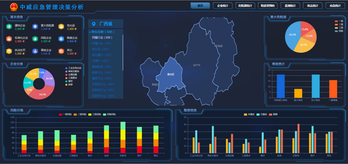 輔助決策子系統(tǒng):圍繞應(yīng)急管理工作中不同專題進(jìn)行綜合分析,不僅能滿足日常監(jiān)管報(bào)表的自動(dòng)生成功能,同時(shí)也體現(xiàn)了如何輔助應(yīng)急管理工作更加智能化、人性化而進(jìn)行預(yù)判,為應(yīng)急管理工作掌握重點(diǎn)方向,抓住關(guān)鍵問(wèn)題。主要功能包括綜合分析、企業(yè)統(tǒng)計(jì)、危險(xiǎn)源統(tǒng)計(jì)、監(jiān)測(cè)預(yù)警統(tǒng)計(jì)、執(zhí)法統(tǒng)計(jì)和應(yīng)急統(tǒng)計(jì)。