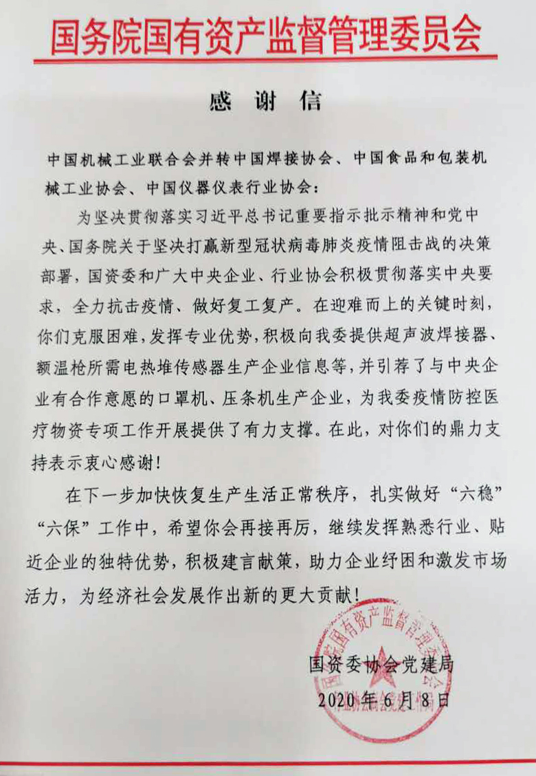 自年初新冠疫情發生以來,國資委協會黨建局和國資委系統各級黨組織積極協調系統內各單位加強有關防疫物資及相關產品信息的溝通和橫向聯系,助力防疫抗疫。我協會積極參與該活動,利用了解和掌握的行業情況和會員企業資源,給國資委協會黨建局提供與防疫產品相關的會員和產品信息,為國資委系統防疫抗疫發揮積極作用,為此,國資委協會黨建局特發來感謝信,對我協會給予表揚和感謝。