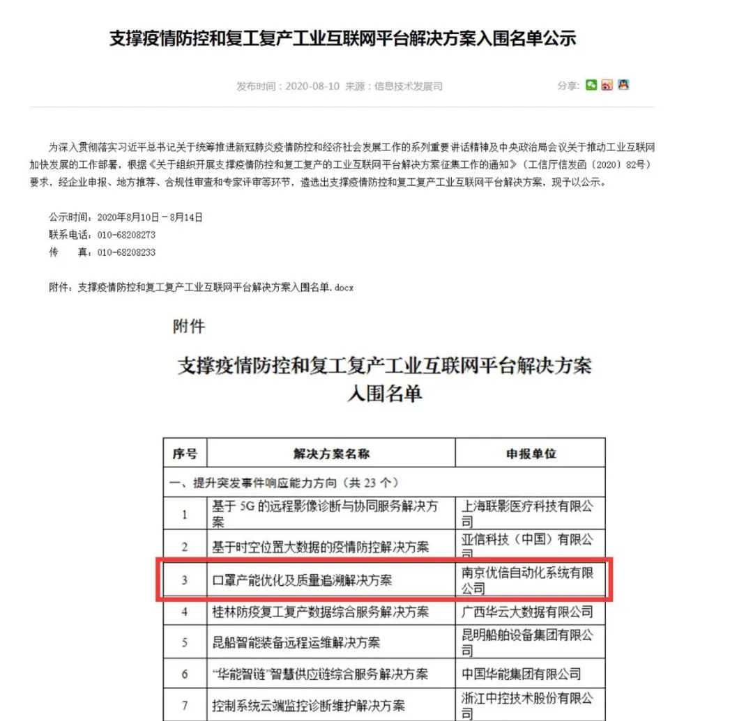 優倍 “口罩產能優化及質量追溯解決方案"810日入圍工信部公示的支撐疫情防控和復工復產工業互聯網平臺解決方案名單。本方案重點解決通過工業互聯網技術的應用,有效提升產業或企業對突發事件響應能力。