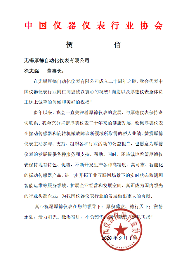 值此無錫厚德自動化儀表有限公司成立二十周年之際,我會向其發(fā)去賀信,代表中國儀器儀表行業(yè)同仁向無錫厚德公司徐志強(qiáng)董事長及厚德儀表全體員工送上誠摯的問候和美好的祝福!