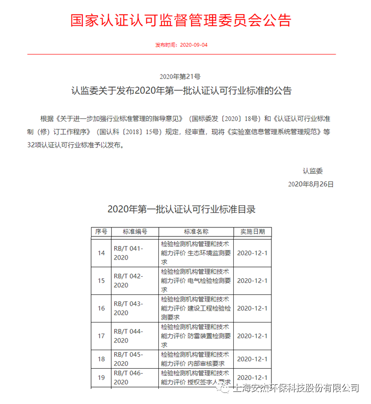 2020年9月4日,國家認(rèn)證認(rèn)可監(jiān)督管理委員會(huì)發(fā)布《2020年第21號(hào) 認(rèn)監(jiān)委關(guān)于發(fā)布2020年第一批認(rèn)證認(rèn)可行業(yè)標(biāo)準(zhǔn)的公告》,《RB/T 041-2020 檢驗(yàn)檢測機(jī)構(gòu)管理和技術(shù)能力評(píng)價(jià) 生態(tài)環(huán)境監(jiān)測要求》、《RB/T 042-2020 檢驗(yàn)檢測機(jī)構(gòu)管理和技術(shù)能力評(píng)價(jià) 電氣檢驗(yàn)檢測要求》、《RB/T 043-2020 檢驗(yàn)檢測機(jī)構(gòu)管理和技術(shù)能力評(píng)價(jià) 建設(shè)工程檢驗(yàn)檢測要求》、《RB/T 044-2020 檢驗(yàn)檢測機(jī)構(gòu)管理和技術(shù)能力評(píng)價(jià) 防雷裝置檢測要求》、《RB/T 045-2020 檢驗(yàn)檢測機(jī)構(gòu)管理和技術(shù)能力評(píng)價(jià) 內(nèi)部審核要求》、《RB/T 046-2020 檢驗(yàn)檢測機(jī)構(gòu)管理和技術(shù)能力評(píng)價(jià) 授權(quán)簽字人要求》獲得批準(zhǔn)發(fā)布。