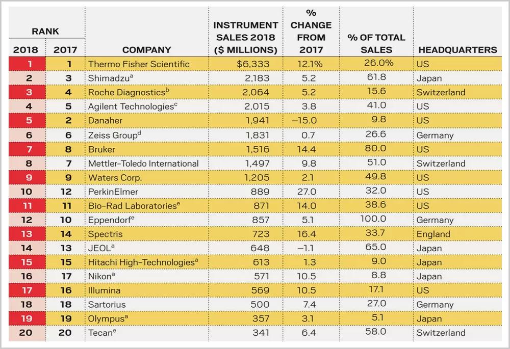 頭號種子賽默飛,自2006年以來共發(fā)起200多次并購。2016年,更是斥資42億美元收購了冷凍電鏡廠商FEI。“并購之王”丹納赫,自1986年上市以來,累計收購600多家公司,其中就包括大名鼎鼎的徠卡。一拆一并之下,國內(nèi)儀器公司與海外巨頭的實力差距,愈發(fā)懸殊。截至目前,中國一共有1000多家科學(xué)儀器廠,大部分產(chǎn)值低于1000萬元。而據(jù)美國化學(xué)會的數(shù)據(jù),2018年全球科學(xué)儀器行業(yè)TOP 20,美國8家,歐洲7家,日本5家,沒有一家中國企業(yè)。